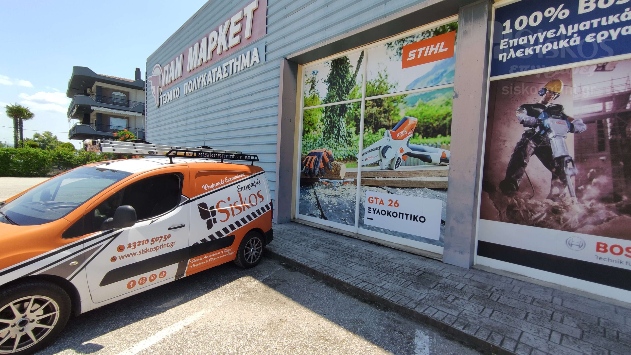 Αναλαμβάνουμε εκτύπωση και τοποθέτηση σε αυτοκόλλητο για αυτοκίνητα , αμμοβολή καθώς και διάτρητο.